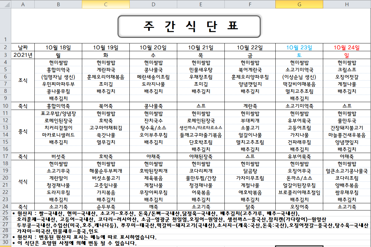주간식단표(2021.10.18 ~ 2021.10.24)