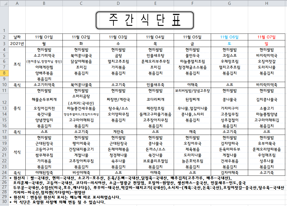 주간식단표(2021.11.01 ~ 2021.11.07)