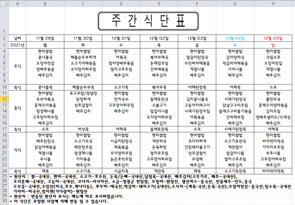 주간식단표(2021.11.29 ~ 2021.12.05)