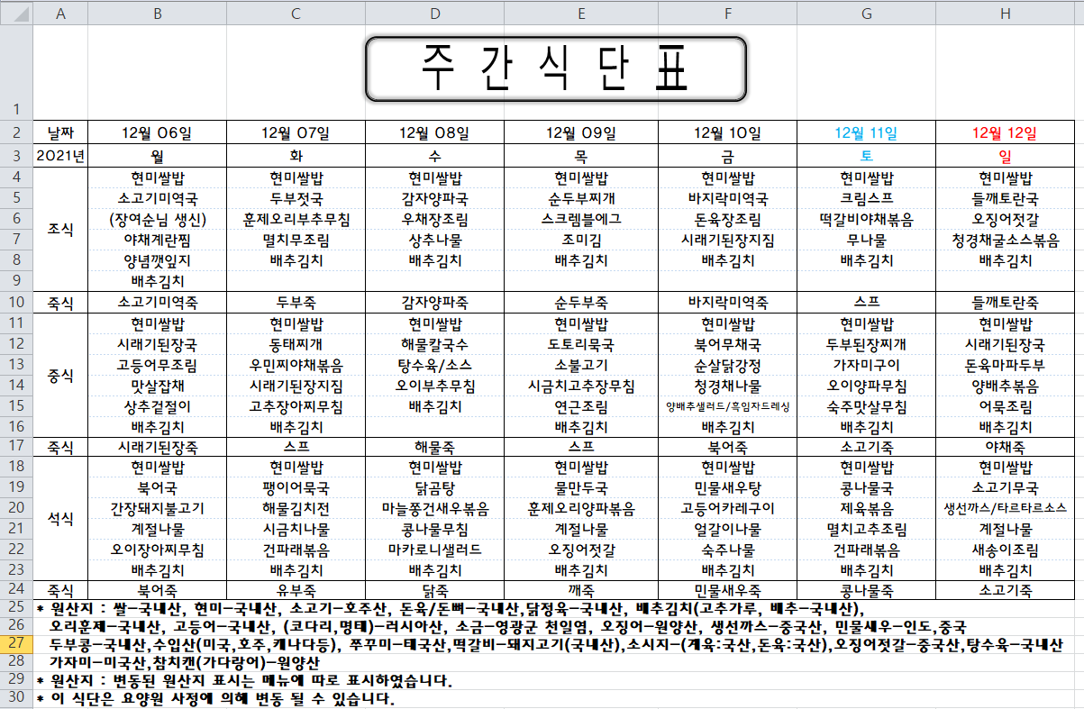 주간식단표(2021.12.06 ~ 2021.12.12)