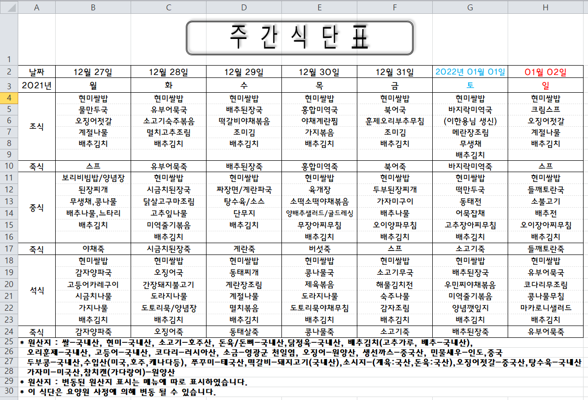 주간식단표 (2021.12.27 ~ 2022.1.2)