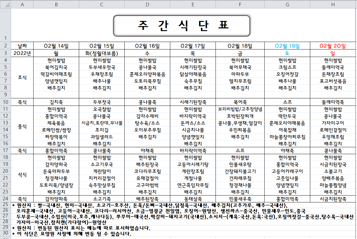 주간식단표(2022.02.14 ~ 2022.02.20)