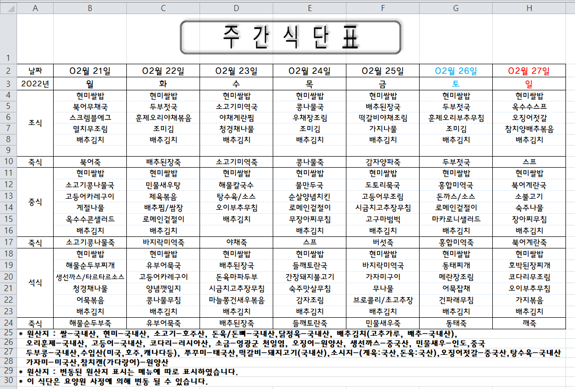 주간식단표(2022.02.21 ~ 2022.02.27)