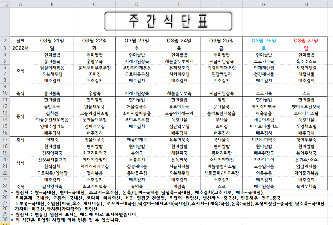 주간식단표 (2022 03.21 ~ 2022.03.27)