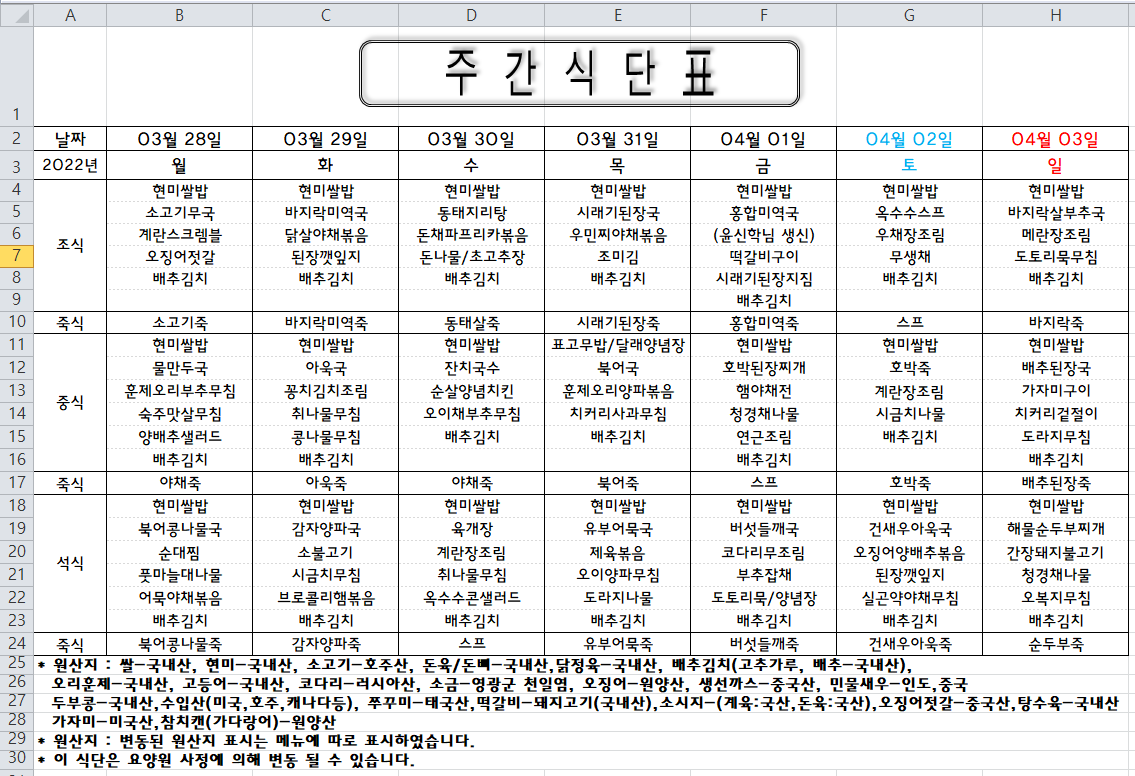 주간식단표 (2022.03.28 ~ 2022.04.03)