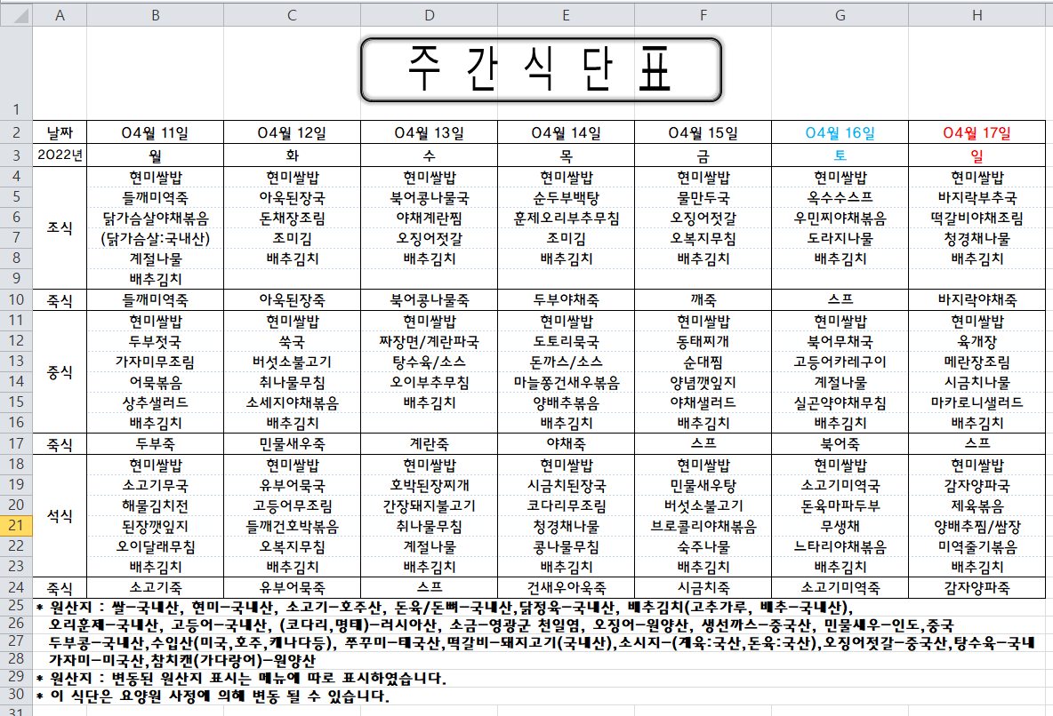 주간식단표 (2022.04.11 ~ 2022.04.17)