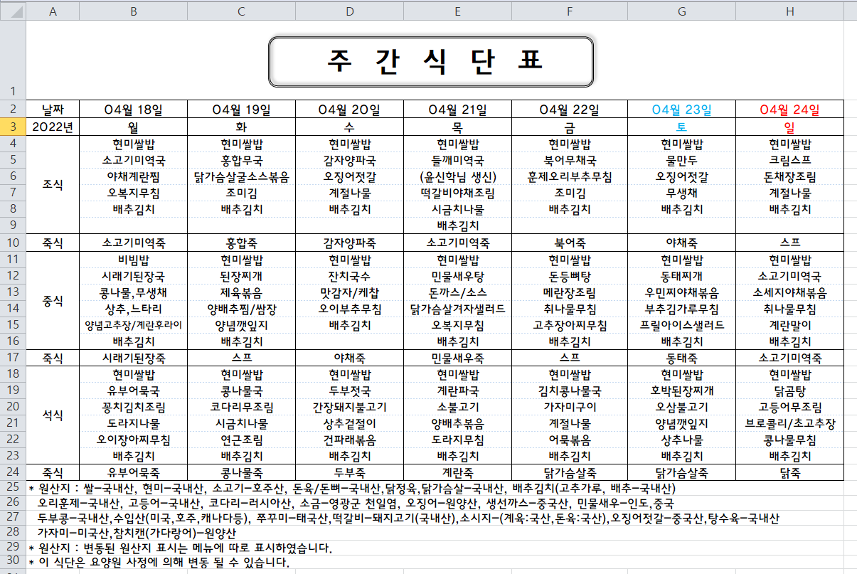 주간식단표 (2022.04.18 ~ 2022.04.24)