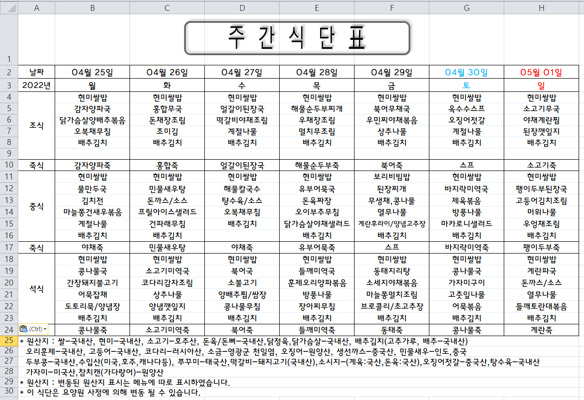 주간식단표(2022.04.25 ~ 2022.05.01)