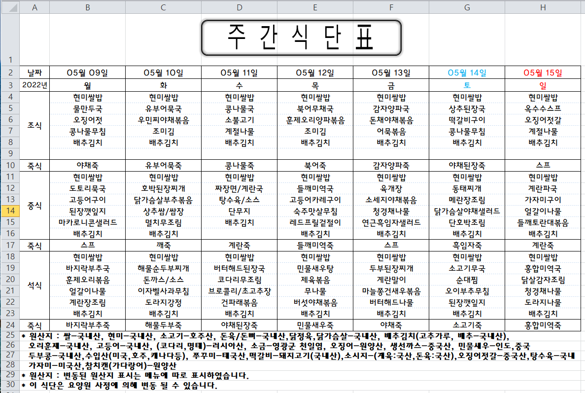 주간식단표(2022.05.09 ~ 2022.09.15)