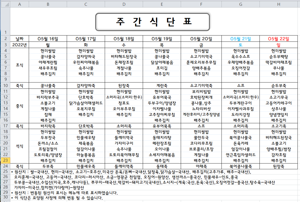 주간식단표 (2022.05.16 ~ 2022.05.22)