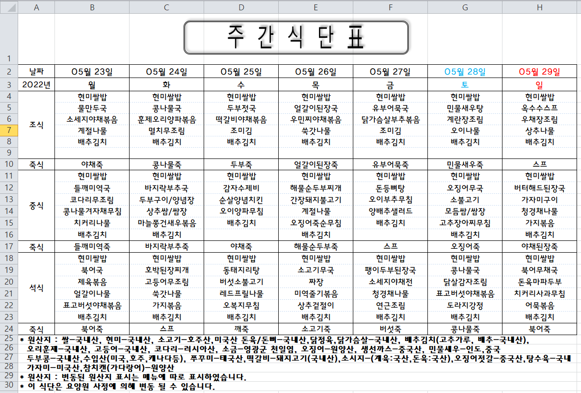 주간식단표 (2022.05.23 ~ 2022.05.29)