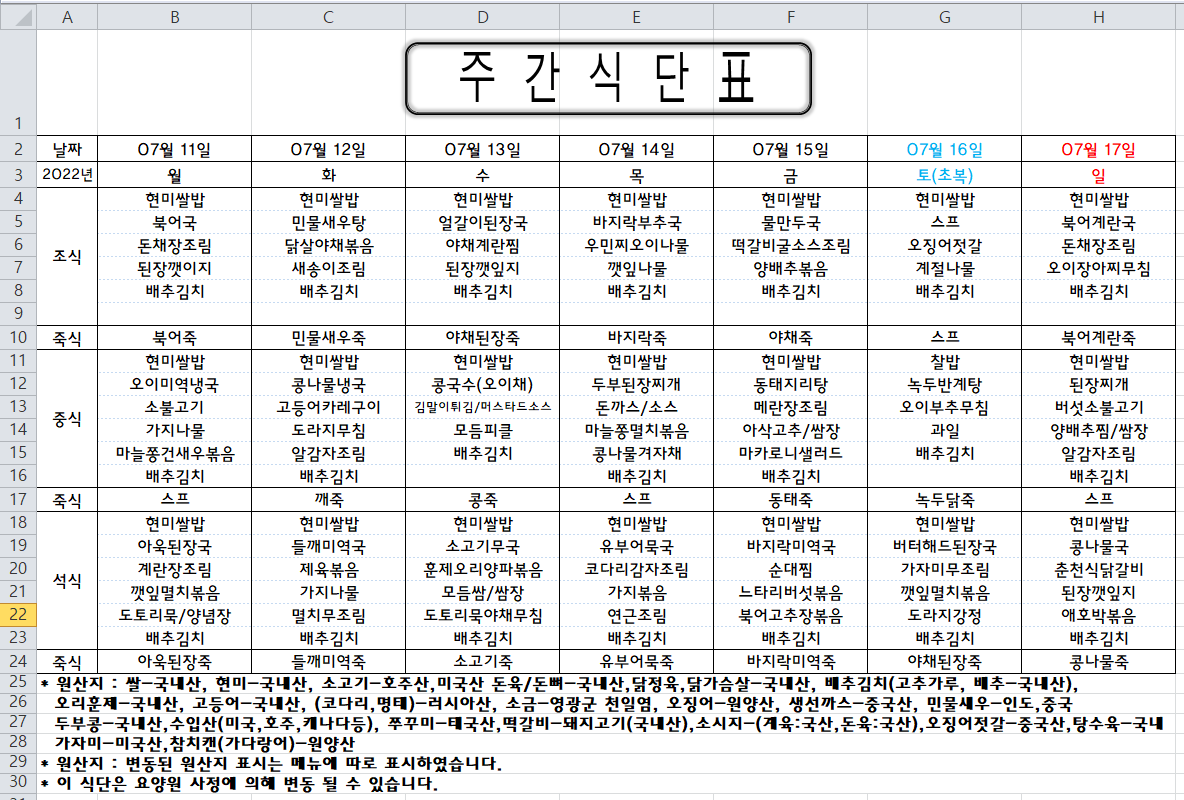 주간식단표(2022.07.11 ~ 2022.07.17)