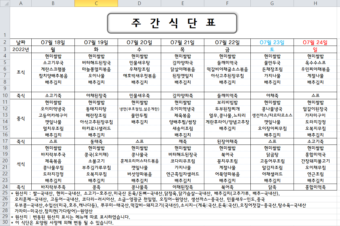 주간식단표(2022.07.18 ~ 2022.07.24)