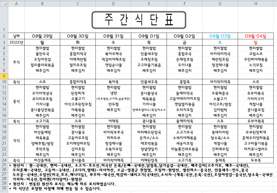 주간식단표(2022.08.29 ~ 2022.09.04)
