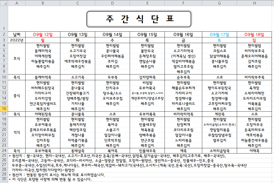 주간식단표 (2022.09.12 ~ 2022.09.18)