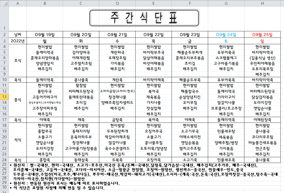 주간식단표 (2022.09.19 ~ 2022.09.25)
