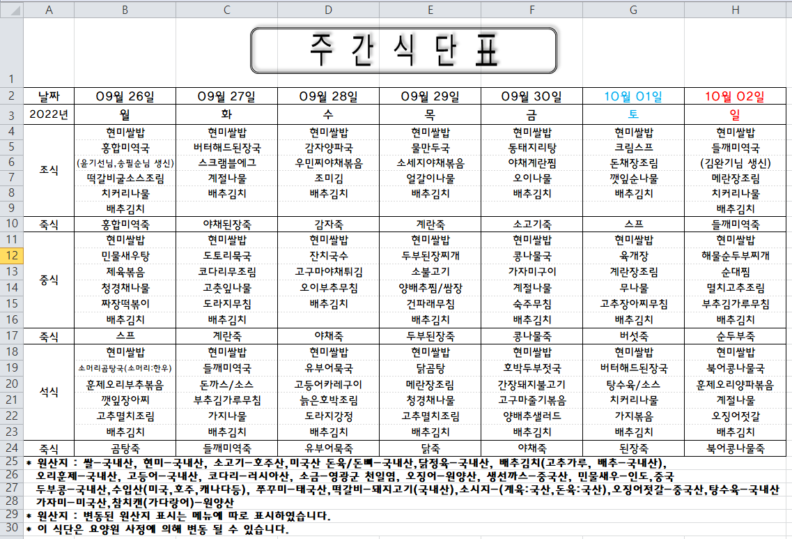 주간식단표 (2022.09.26 ~ 2022.10.02)