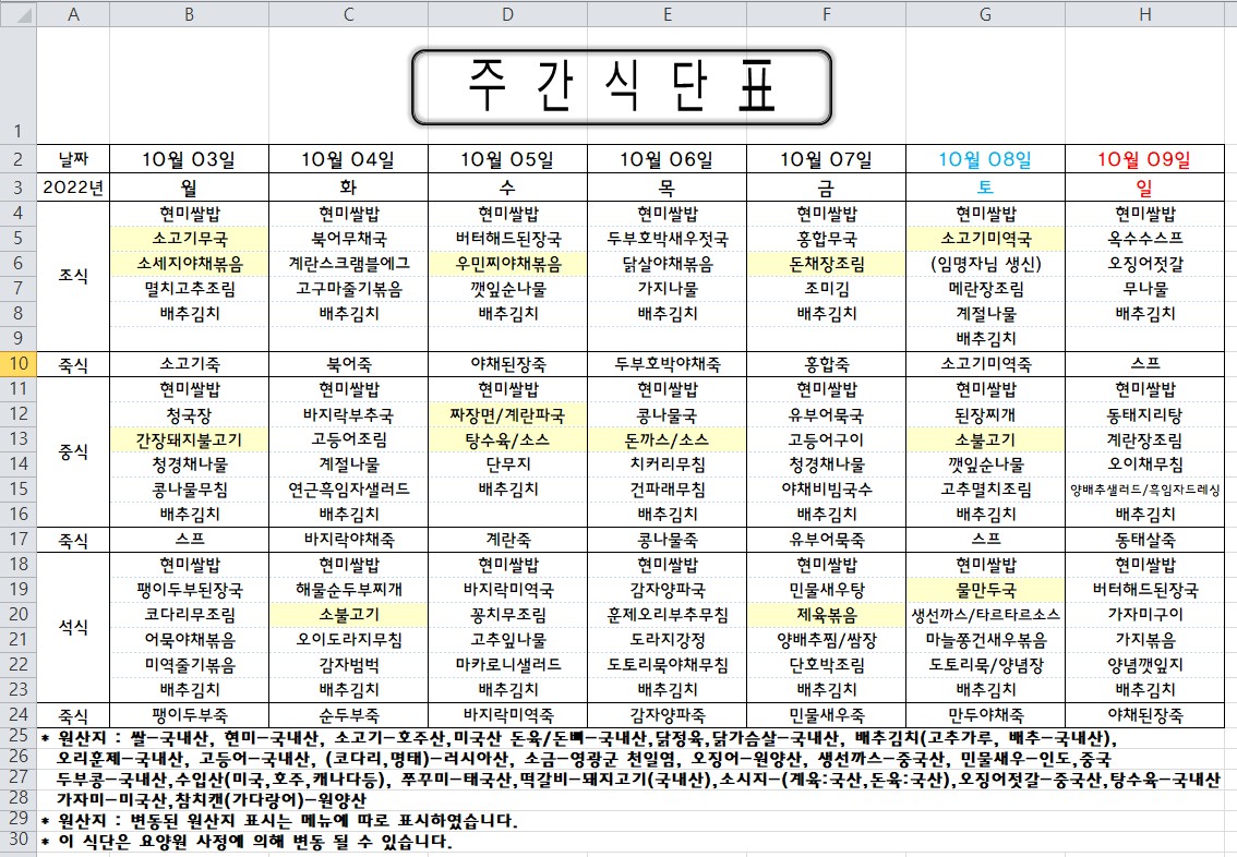 주간식단표 (2022.10.03 ~ 2022.10.09)