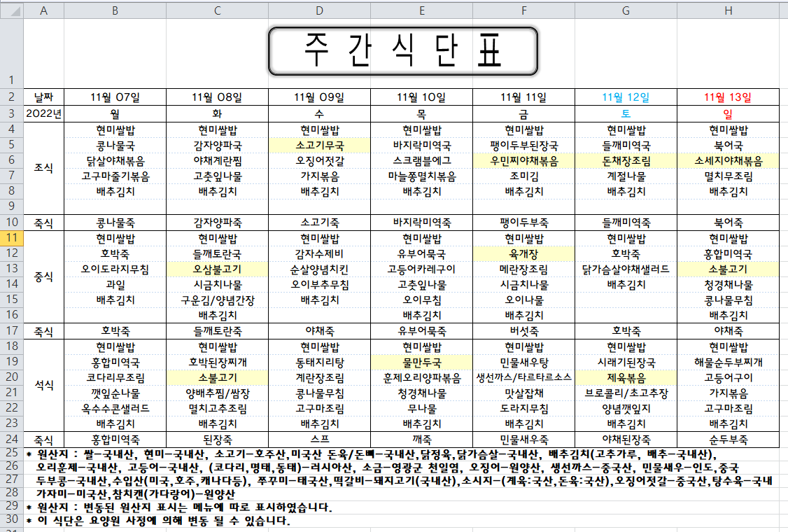 주간식단표 (2022.11.07 ~ 2022.11.13)