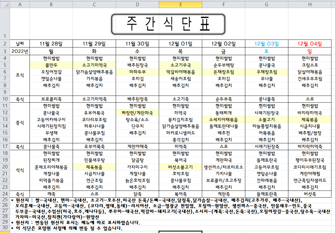 주간식단표 (2022.11.28 ~ 2022.12.04)