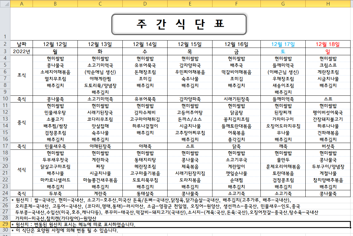 주간식단표 (2022.12.12 ~ 2022.12.18)