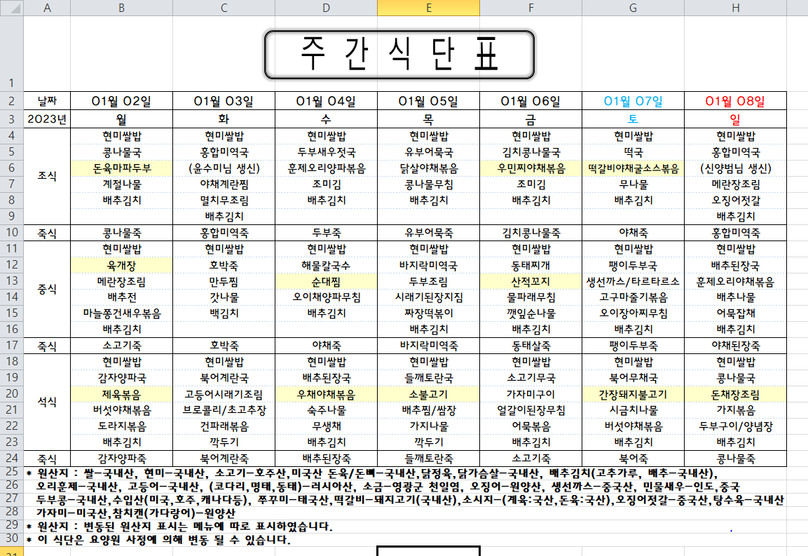 주간식단표 (2023.01.02 ~ 2023.01.08)