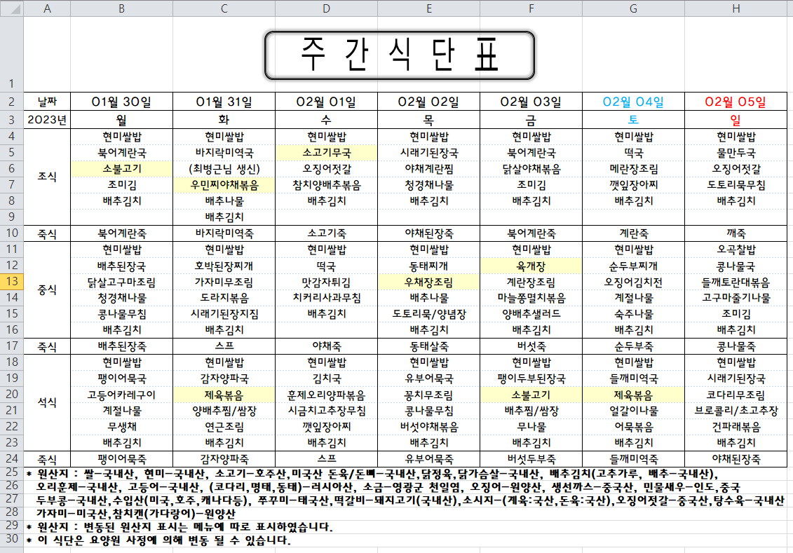 주간식단표 (2023.01.30 ~ 2023.02.05)
