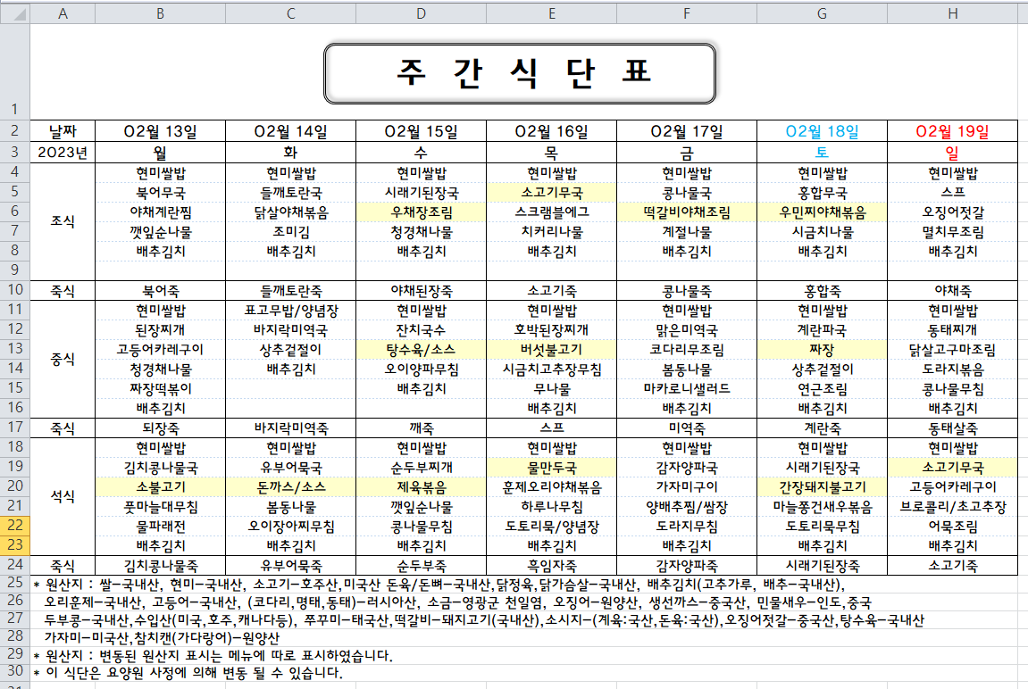 주간식단표 (2023.02.13 ~ 2023.02.19)