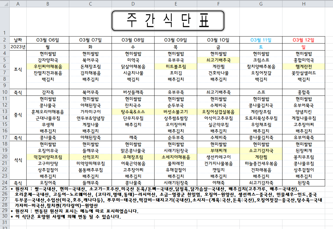 주간식단표 (2023.03.06 ~ 2023.03.12)