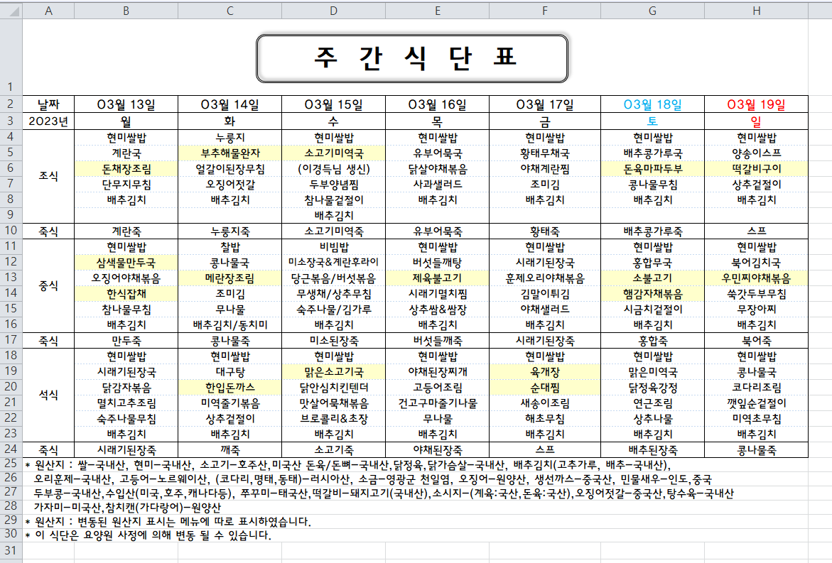 주간식단표 (2023.03.13 ~ 2023.03.19)