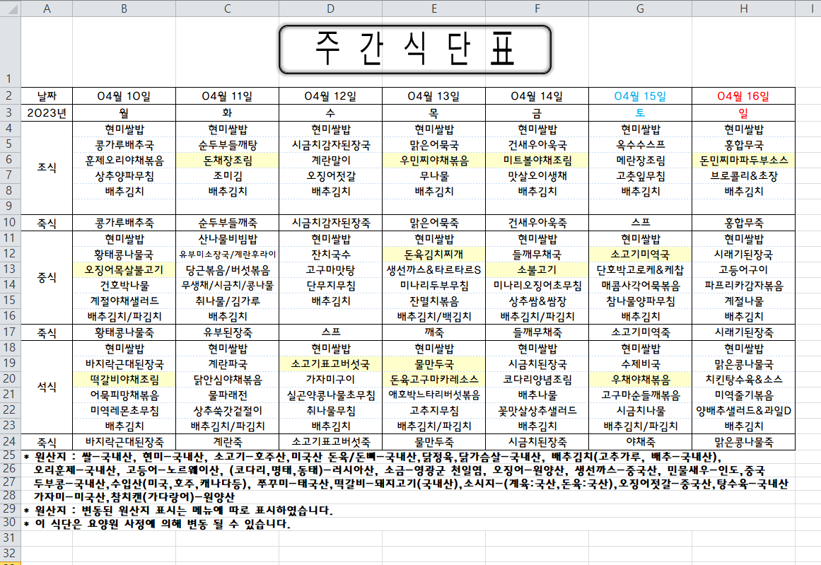 주간식단표 (2023.04.10 ~ 2023.04.16)