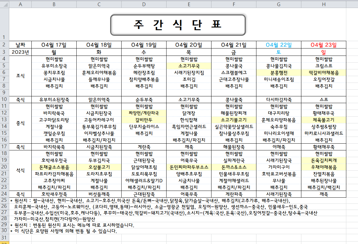주간식단표 (2023.04.17 ~ 2023.04.23)