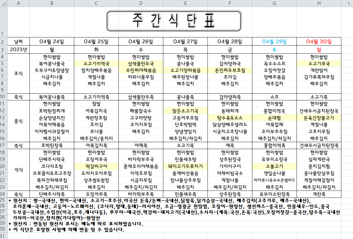 주간식단표 (2023.04.24 ~ 2023.04.30)