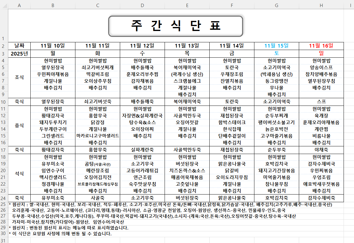 주간식단표 (2025.11.10 ~ 2025.11.16)