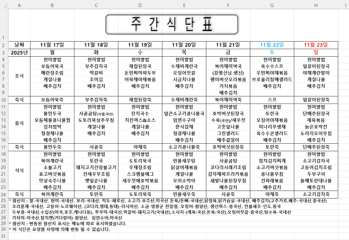 주간식단표 (2025.11.17 ~ 2025.11.23)