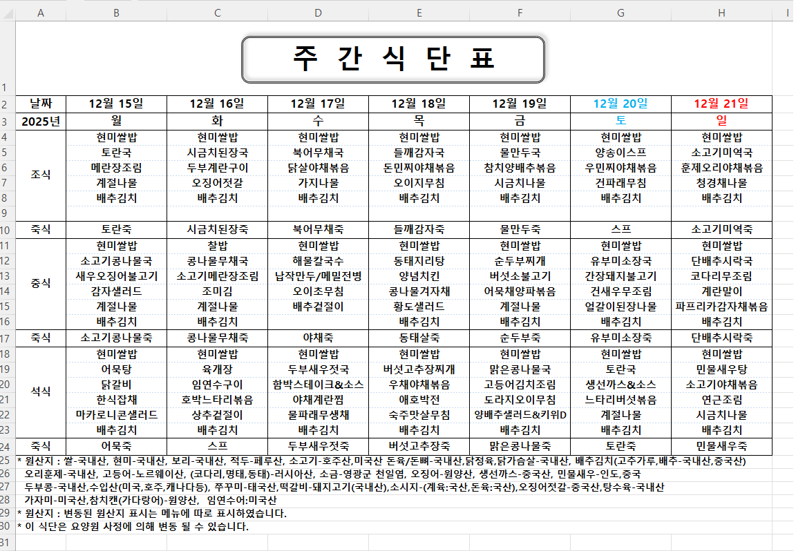 주간식단표 (2025.12.15 ~ 2025.12.21)