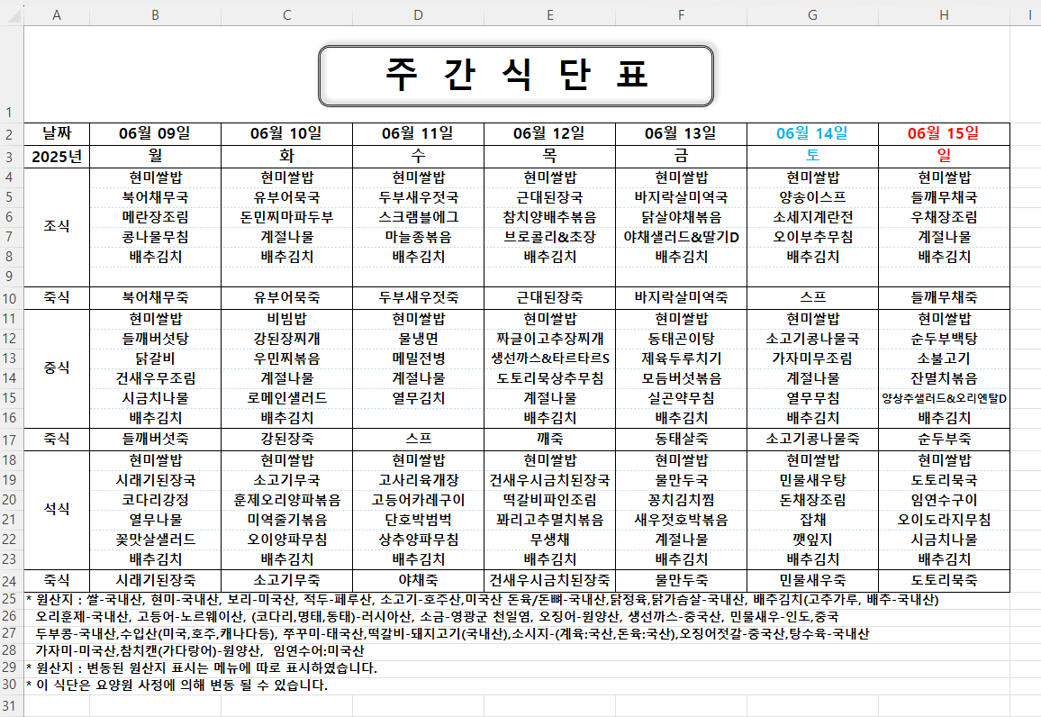 주간식단표 (2025.06.09 ~ 2025.06.15)