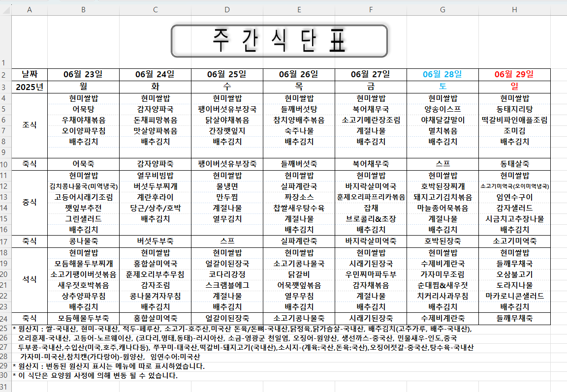 주간식단표 (2025.06.23 ~ 2025.06.29)