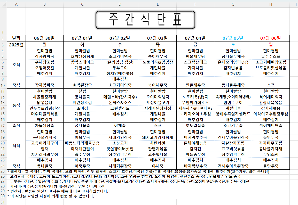 주간식단표 (2025.06.30 ~ 2025.07.06)