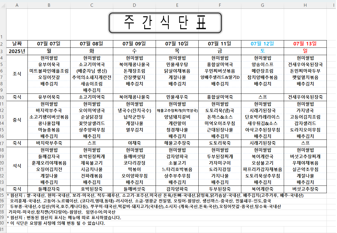주간식단표 (2025.07.07 ~ 2025.07.13)