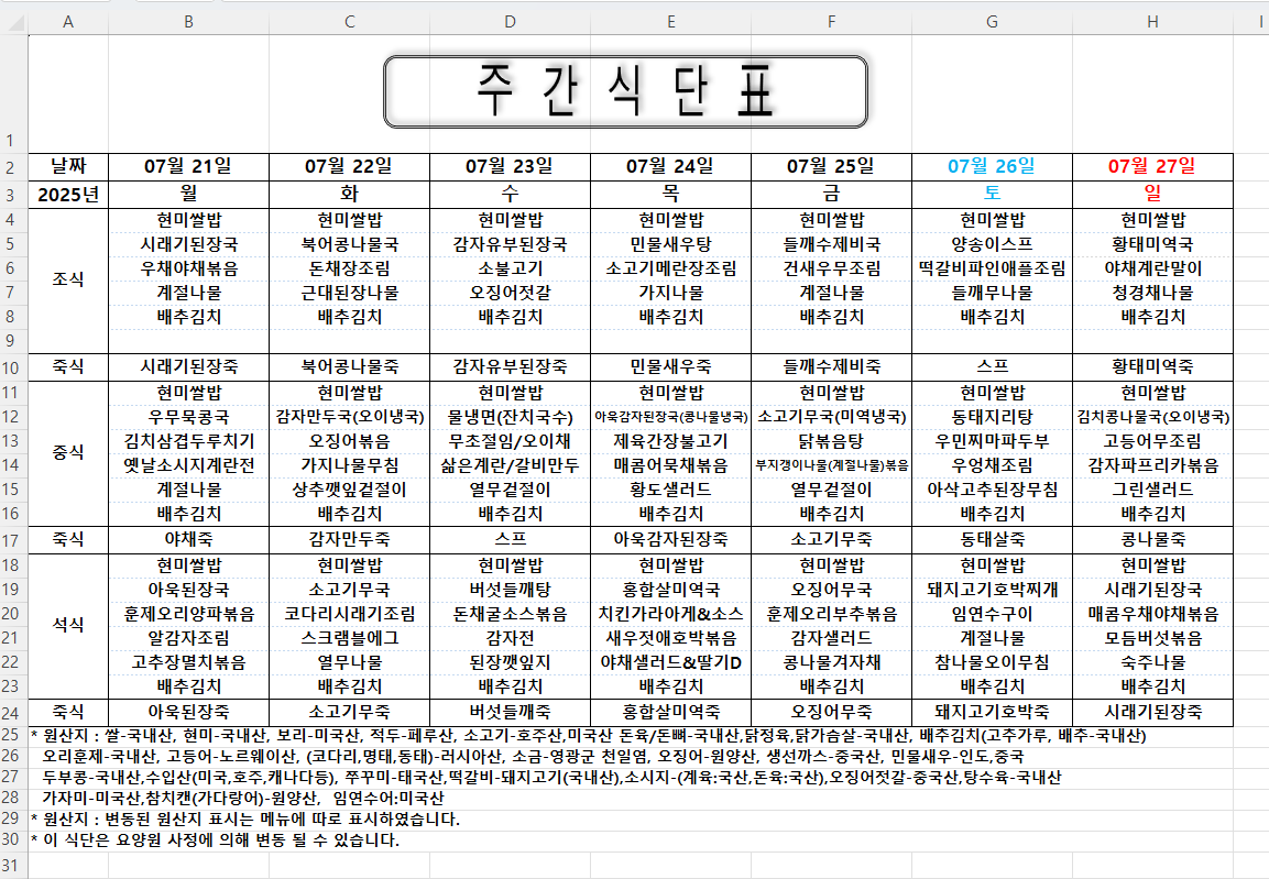 주간식단표 (2025.07.21 ~ 2025.07.27)