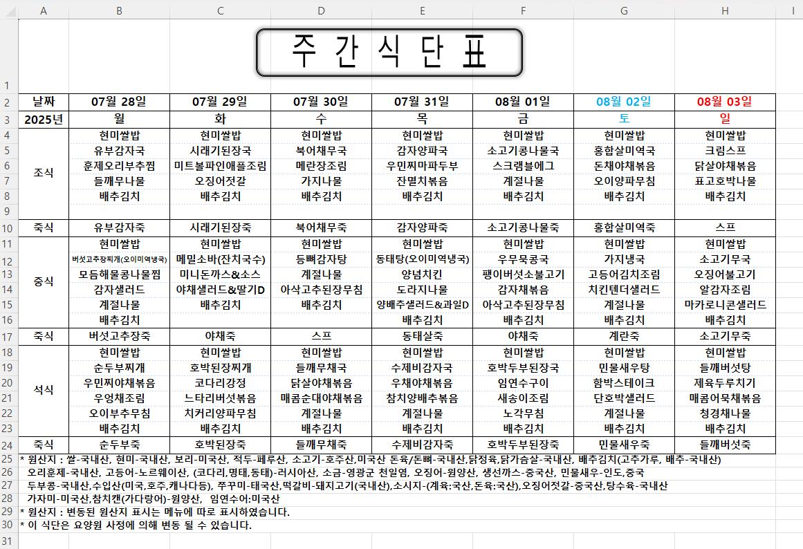 주간식단표 (2025.07.28 ~ 2025.08.03)