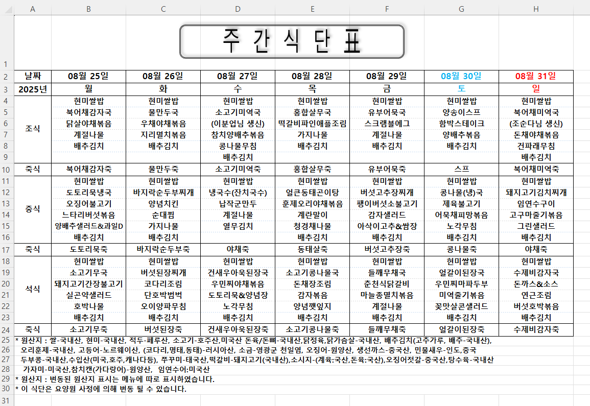 주간식단표 (2025.08.25 ~ 2025.08.31)