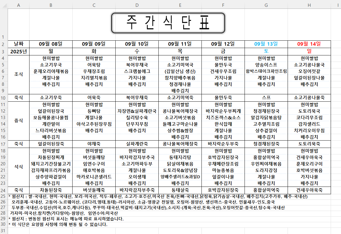 주간식단표 (2025.09.08 ~ 2025.09.14)
