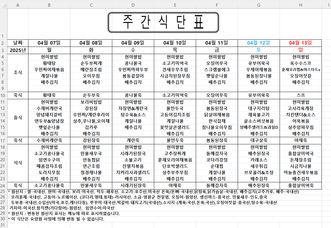 주간식단표 (2025.04.07 ~ 2025.04.13)