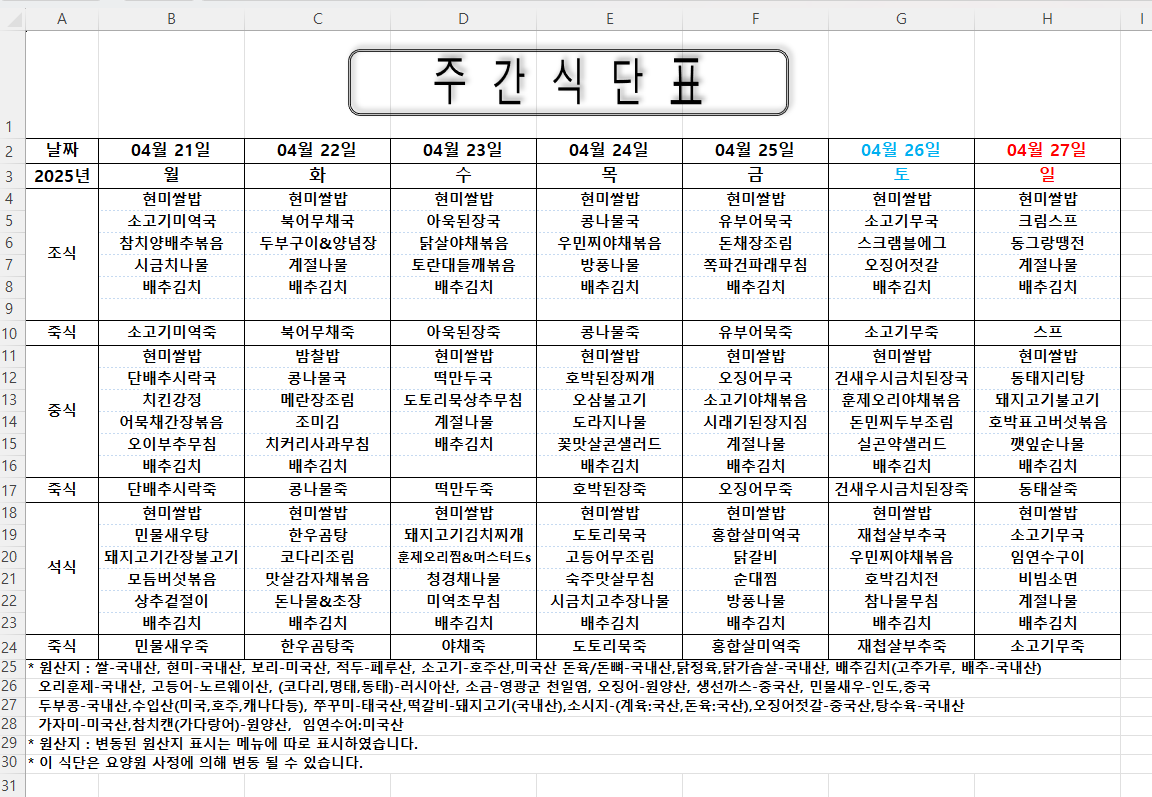 주간식단표 (2025.04.21 ~ 2025.04.27)