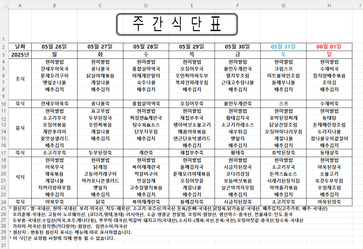 주간식단표 (2025.05.26 ~ 2025.06.01)