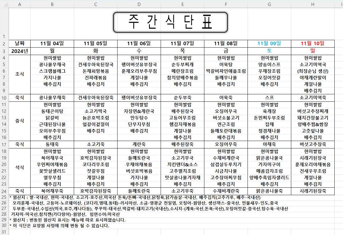 주간식단표 (2024.11.04 ~ 2024.11.10)