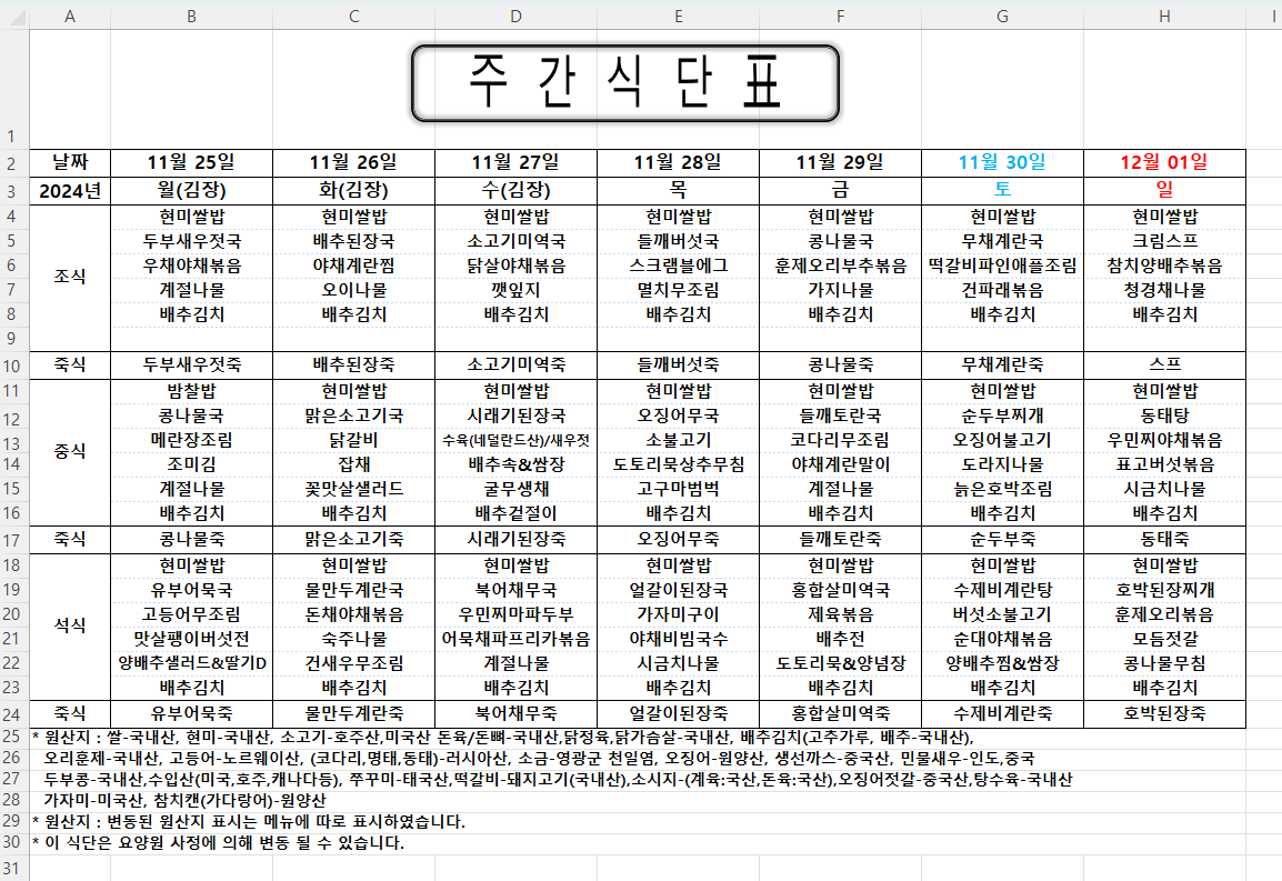 주간식단표 (2024.11.25 ~ 2024.12.01)
