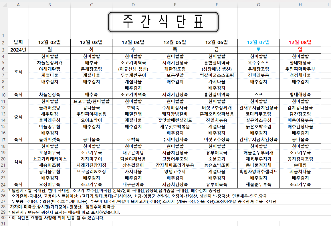 주간식단표 (2024.12.02 ~ 2024.12.08)